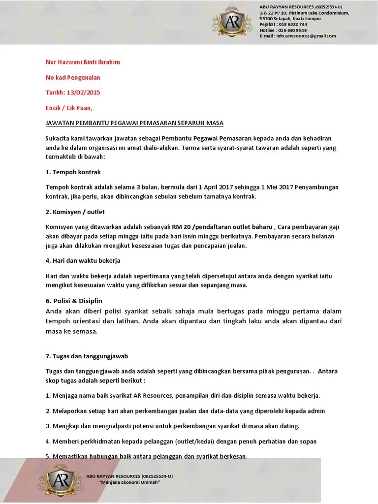 Puan farah jasmin,surat tawaran pekerjaan.merujuk pekara di atas, dengan sukacita syarikat kami ingin menawarkan jawatansebagai pembantu tadbir / pembantu .